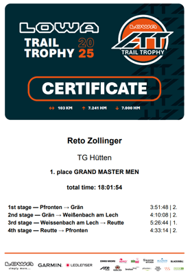 Reto Zollinger ist Gesamtsieger GRAND MASTER MEN der ersten Lowe Trail Trophy 2025! Vom Donnerstag, 22. Mai 2025 bis Sonntag, 25. Mai 2025, waren 4 herausfordernde Trailruns zu absolvieren, die insgesamt 103 km und 7241 Höhenmeter umfassten.