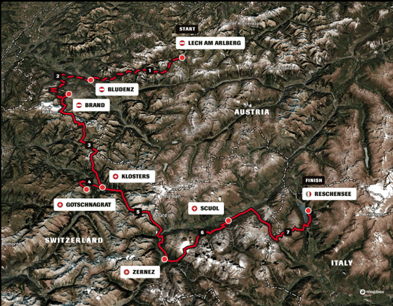 1: Lech am Arlberg (AUT) - Bludenz (AUT) (39.0 km, + 1.450 Hm, -2.350 Hm) |